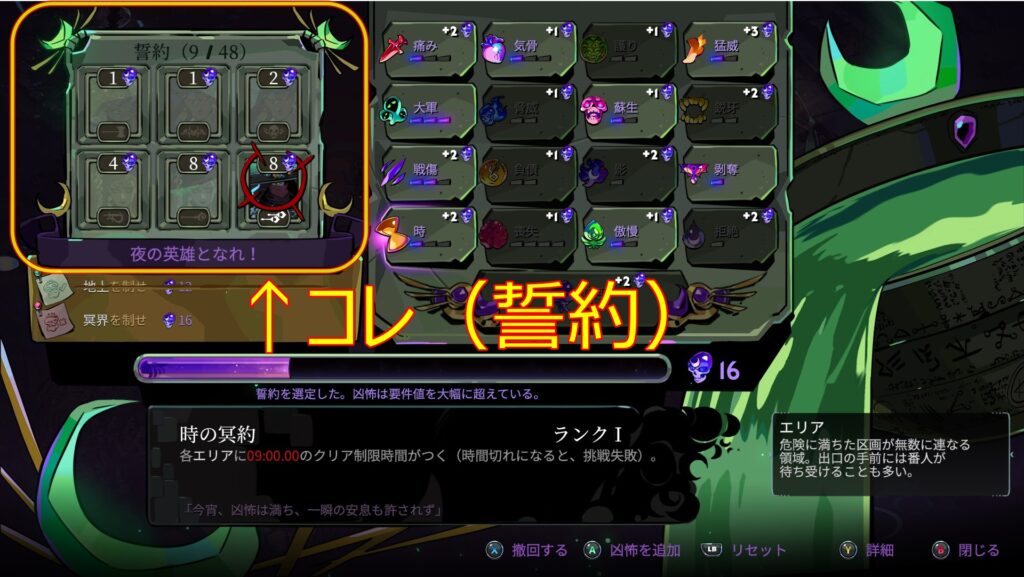 難易度増減の細かい調整を自分で決められるのはHADESのおもしろいところ。
