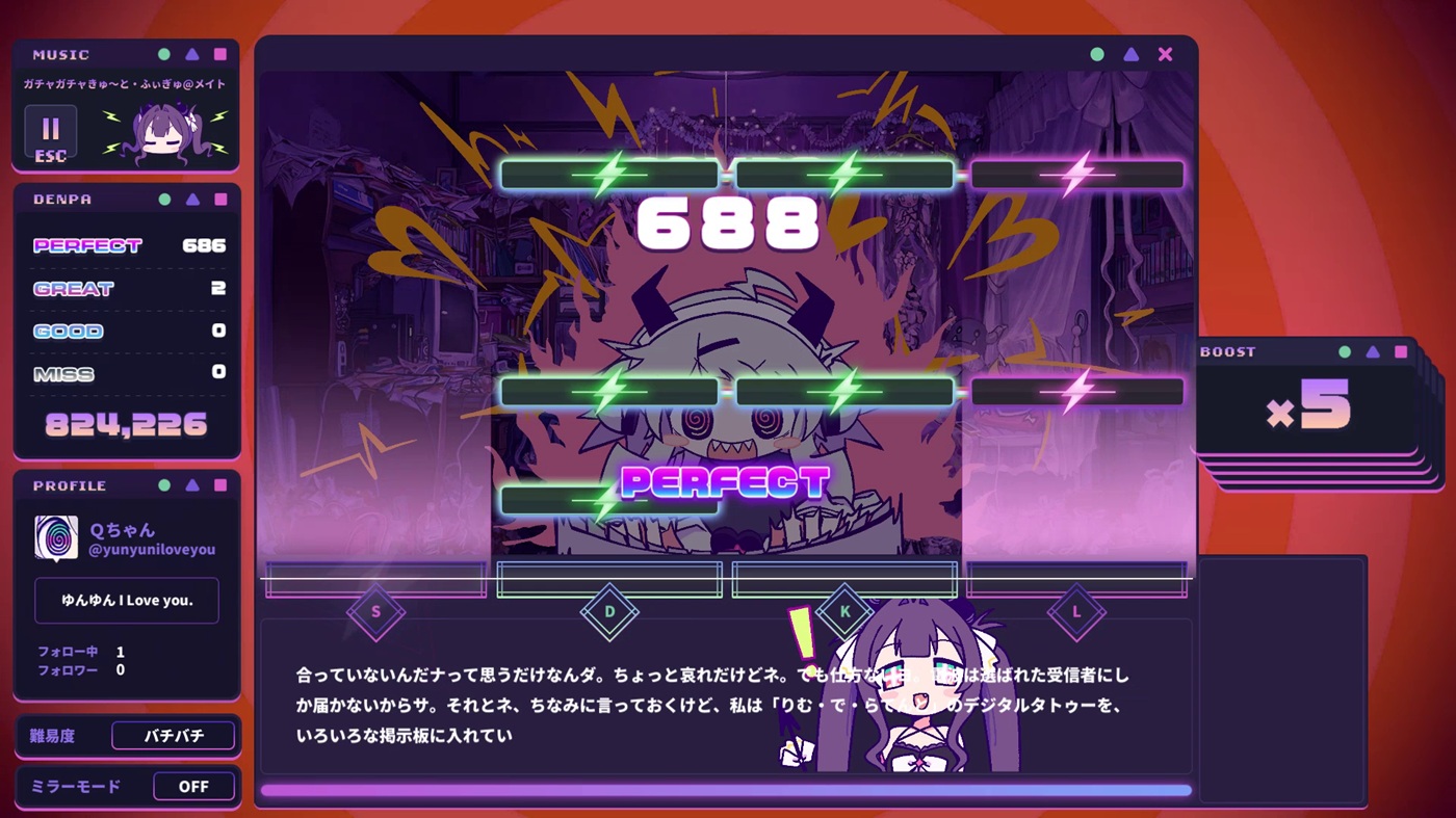 リズムゲーム中でもキャラはよく喋り、怪文書を入力している演出でキーボードの打鍵音が鳴りまくり、画面は揺れたりして何かと演出で妨害してくる。